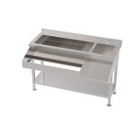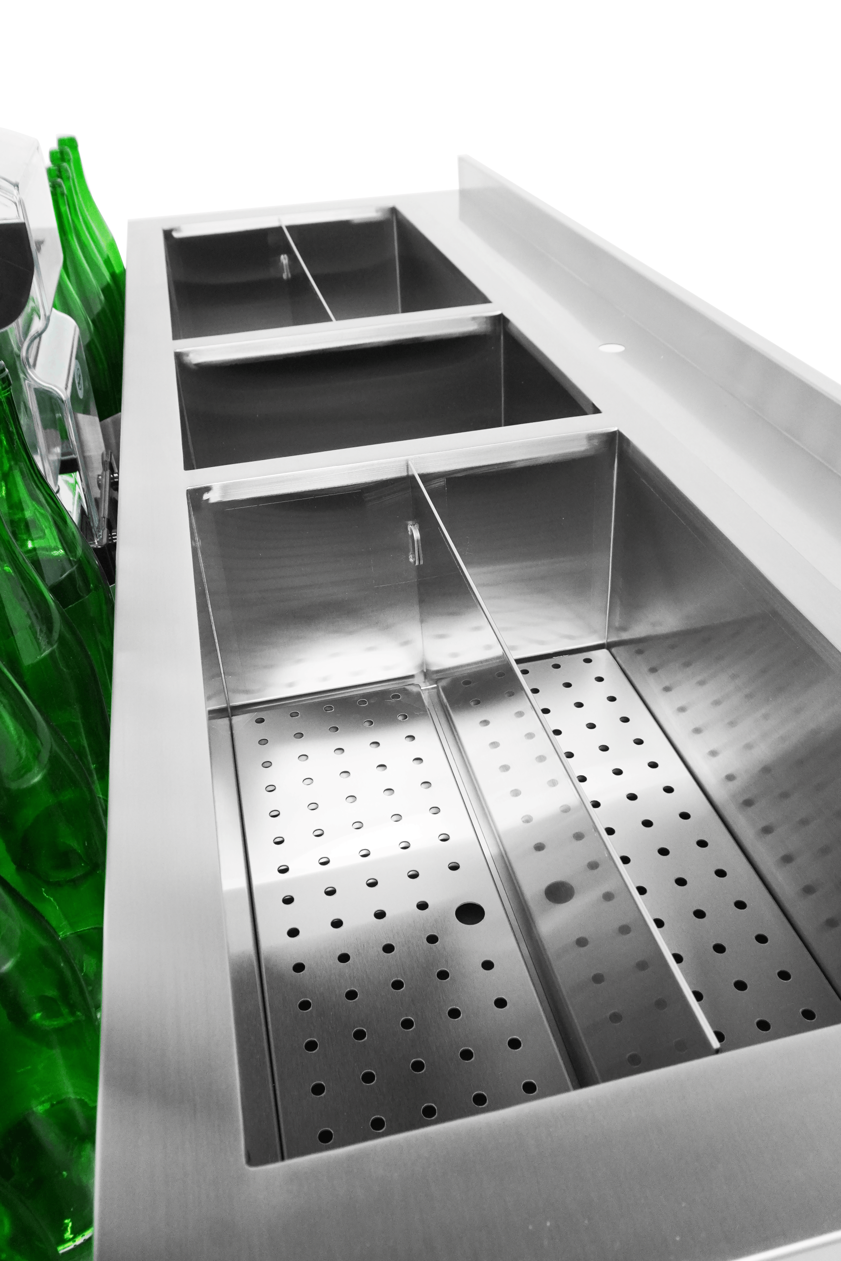 Cette station de bar à cocktails robuste est spécialement conçue pour une utilisation dans des bars professionnels et offre un espace de travail efficace pour la préparation des boissons. Il est équipé de 2 bacs à glace isolé avec des séparateurs, d’un speedrail pratique à l’avant pour un accès rapide aux bouteilles et d’une étagère pour un mixeur. Le rebord surélevé à l’arrière empêche les objets de tomber de la station. Le modèle est livré avec un siphon et un tuyau de vidange, mais sans robinet. Les dimensions sont de 1600x713x890 mm (LxPxH) – poids 67 kg.