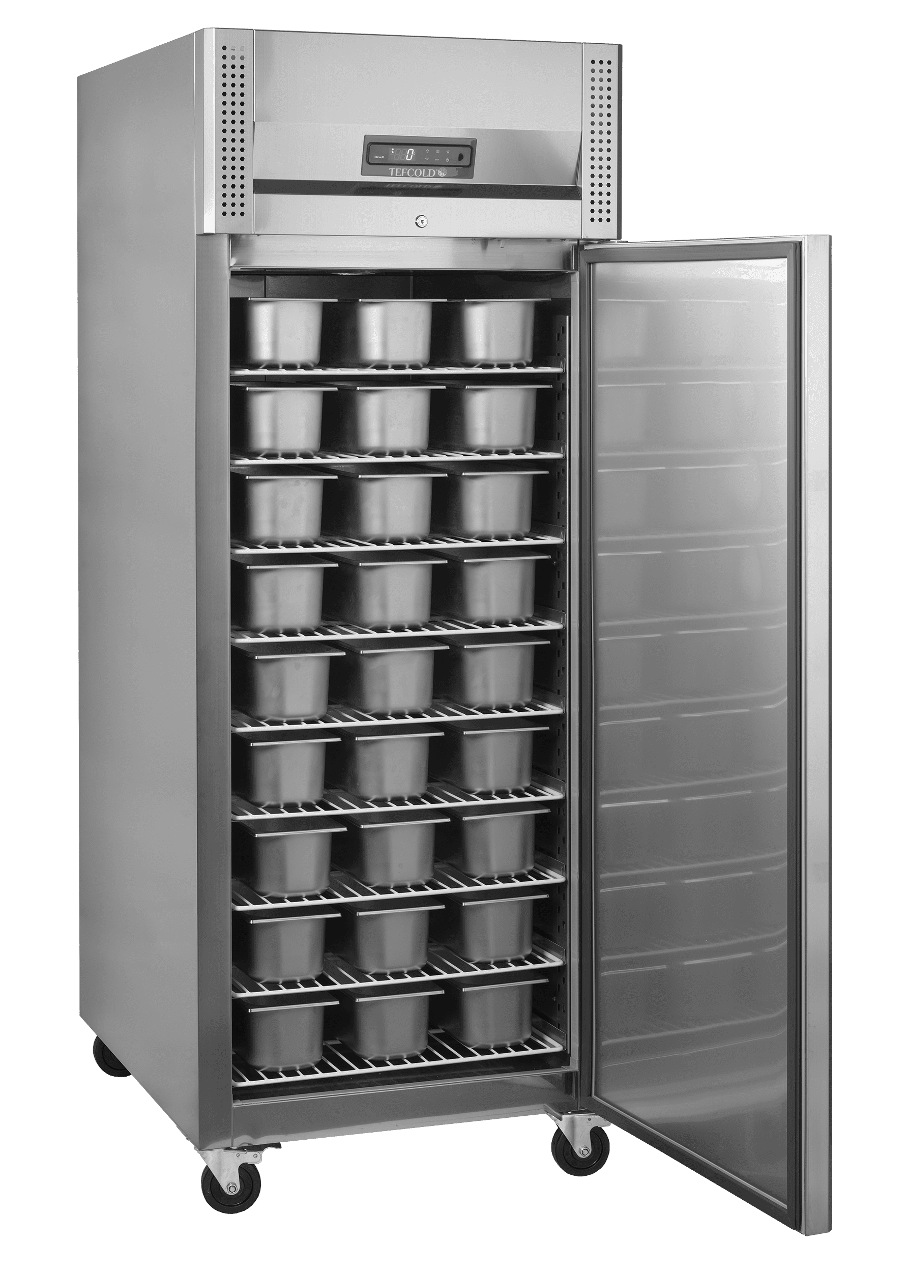 Le congélateur BF850I est optimisé pour le stockage de pâtisseries et de glaces. Il respecte les dimensions Euronorm, avec des guides pour plaques pâtissières. Il est fourni avec des tablettes pouvant recevoir jusqu’à 54 bacs Napoli (non fournis). Grâce au froid ventilé, le contenu reste frais, et un thermostat numérique permet de régler la température.