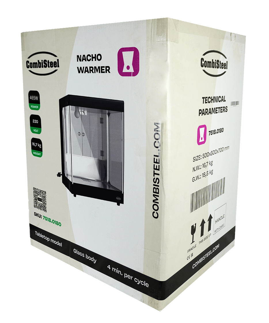 Ce réchaud à nachos est parfait pour diverses applications. Qu’il s’agisse d’un festival gastronomique, d’un cinéma ou d’un événement sportif, cet appareil spacieux constitue la solution idéale. Avec un cycle d’environ 4 minutes, vous fournirez rapidement à tout le monde de délicieux nachos chauds. Son design élégant confère également un aspect professionnel à l’ensemble. Les dimensions sont 500x500x700mm (LxLxH) – consommation 0.19 kW – poids 16.7 kg.