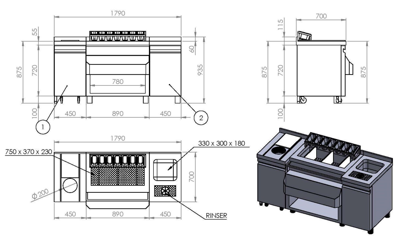 INCL. ÉVIER, LAVE-VERRES, BACS GN, SPEEDRAIL PORTE-BOUTEILLES, PLANCHE À DÉCOUPER ET POUBELLE
