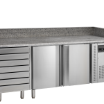 La gamme PT de meubles à pizza est fabriquée en acier inoxydable SS304. Son plan de travail en granite est idéal pour la préparation des pizzas : il reste froid pour empêcher la pâte de coller. Cette gamme est disponible en plusieurs tailles, avec 2 ou 3 portes. Il est également possible de la personnaliser avec des tiroirs. Fournie avec ou sans module pour garniture pour bacs GN – ces modules peuvent être ajoutés par la suite.
