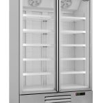 Ce réfrigérateur présente un design moderne, des portes à fermeture automatique, des étagères réglables et un affichage numérique de la température. Le système de refroidissement ventilé assure une réfrigération efficace, tandis que le dégivrage automatique minimise l’entretien. L’éclairage LED illumine vos produits de manière optimale et le chauffage des portes empêche la condensation, pouvant être facilement activé ou désactivé. Les dimensions sont 1880x710x1997 mm (LxPxH) – consommation 0.577 kW – capacité 1530 litres – température 0/+10ºC – poids 207.5 kg.