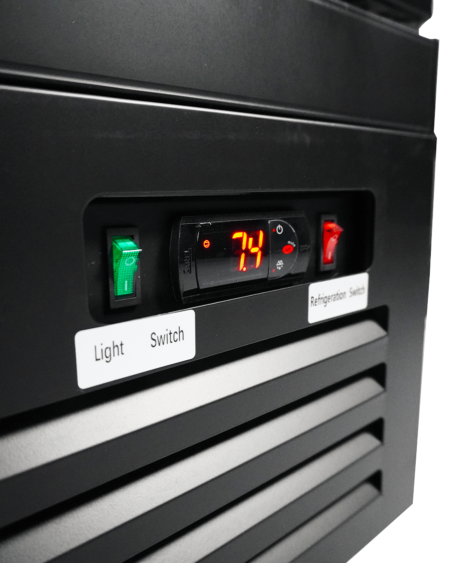 Ce réfrigérateur noir présente un design moderne, des portes à fermeture automatique, des étagères réglables et un affichage numérique de la température. Le système de refroidissement ventilé garantit une réfrigération efficace, tandis que le dégivrage automatique minimise l’entretien. L’éclairage LED met vos produits en valeur de manière optimale, et les portes chauffées empêchent la condensation, facilement activables ou désactivables. Dimensions : 1880x705x2050mm (LxPxH) – consommation 1,08 kW – capacité 1600 litres – temp. 0/+10ºC – poids 214 kg.