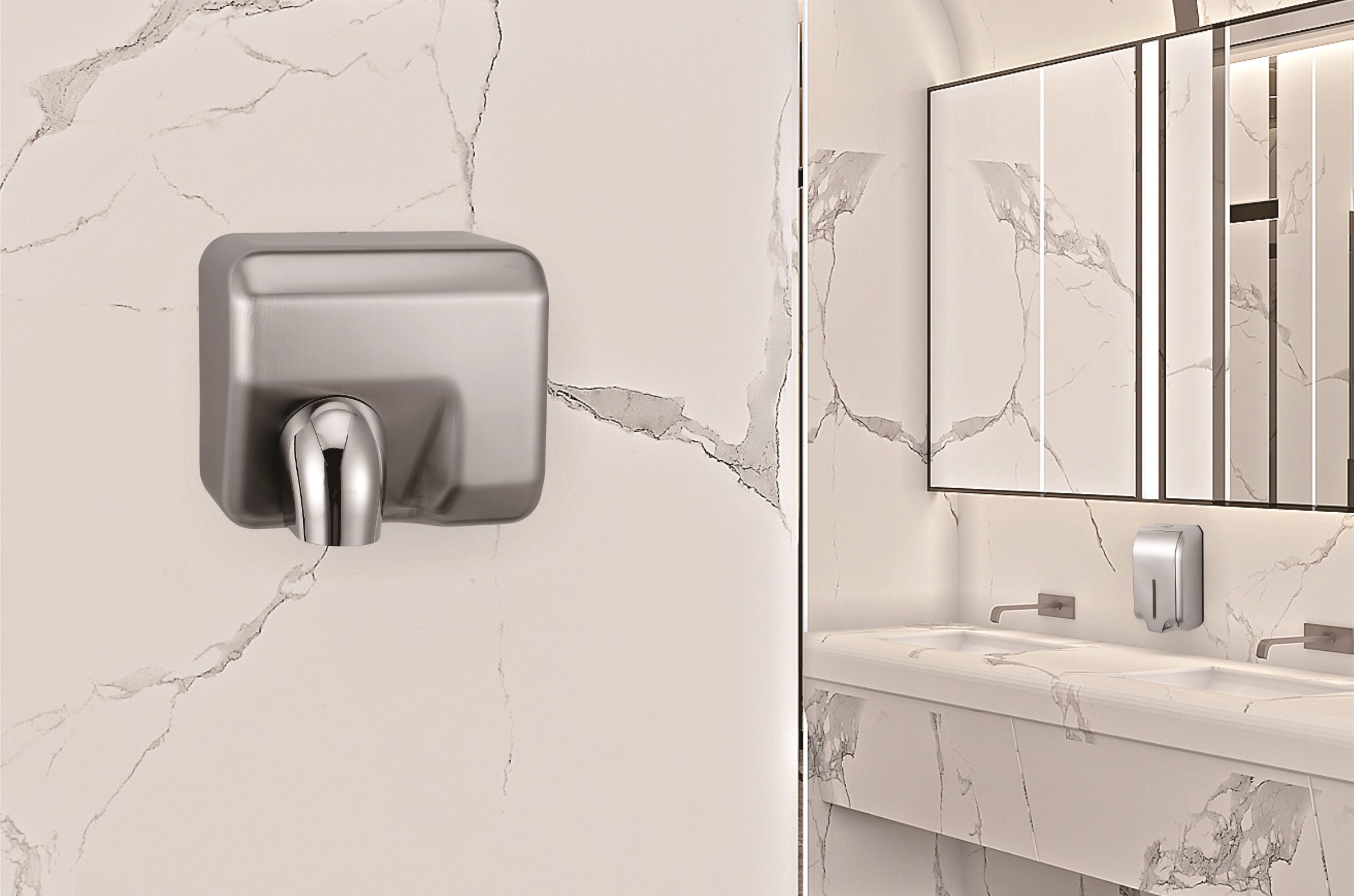 Le sèche-mains HD-04 est une solution compacte et pratique pour le séchage hygiénique des mains dans les espaces sanitaires professionnels. Grâce au choix entre air chaud ou air froid, la consommation d’énergie peut être facilement adaptée à la situation et au niveau de confort souhaité. Le boîtier solide en acier inoxydable garantit une longue durée de vie et une apparence professionnelle, tandis que son design compact rend ce sèche-mains particulièrement adapté aux sanitaires de petite taille dans l’hôtellerie-restauration, les bureaux et les bâtiments publics. Spécifications principales : 262x208x231 mm (LxPxH) – consommation 0,3 kW (air froid) / 2,3 kW (air chaud) – poids 5 kg – temps de séchage 15–20 sec.