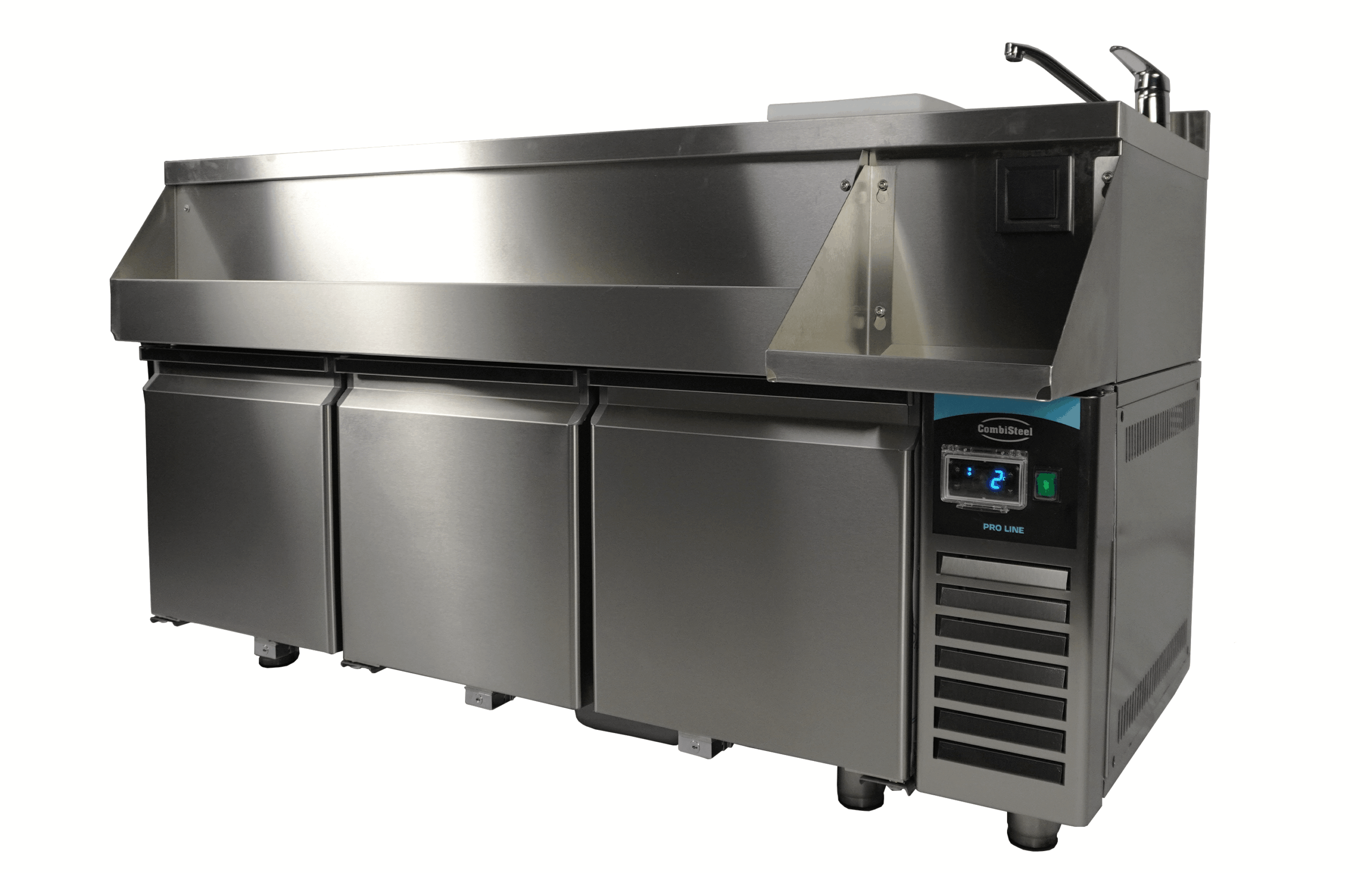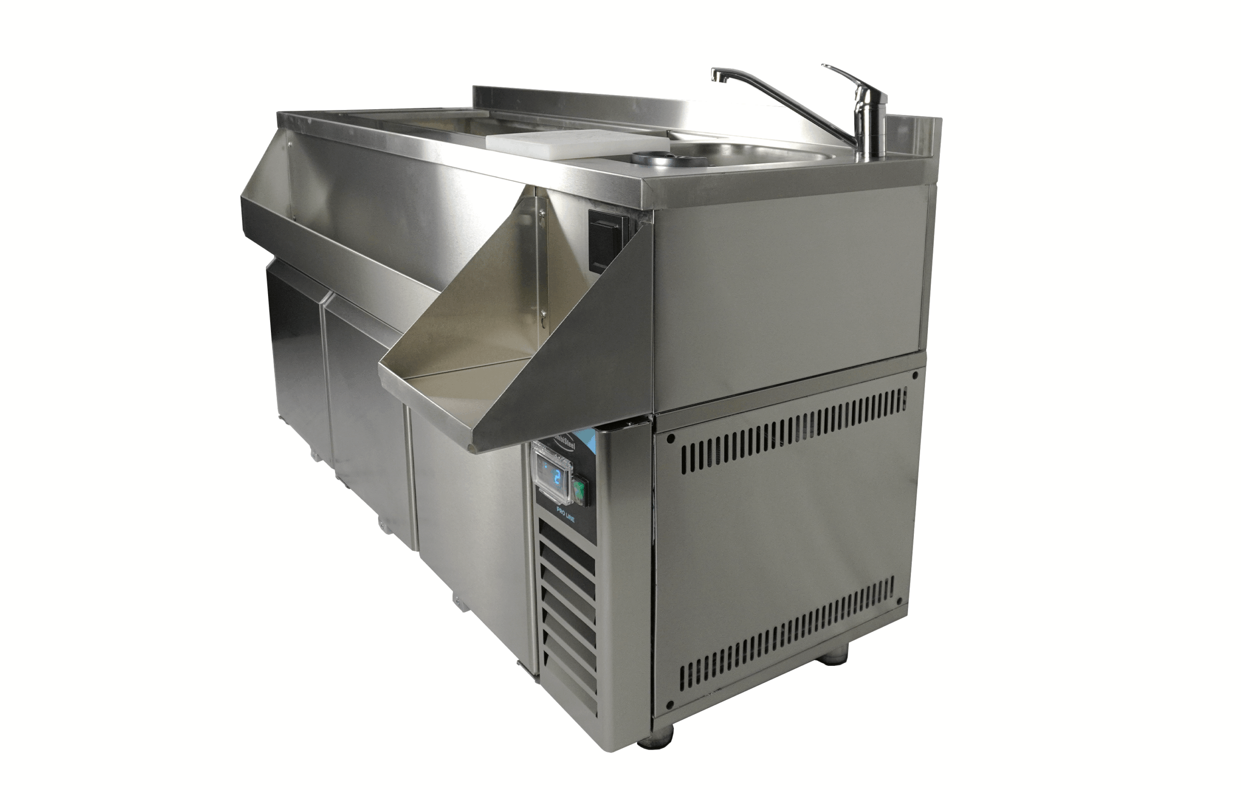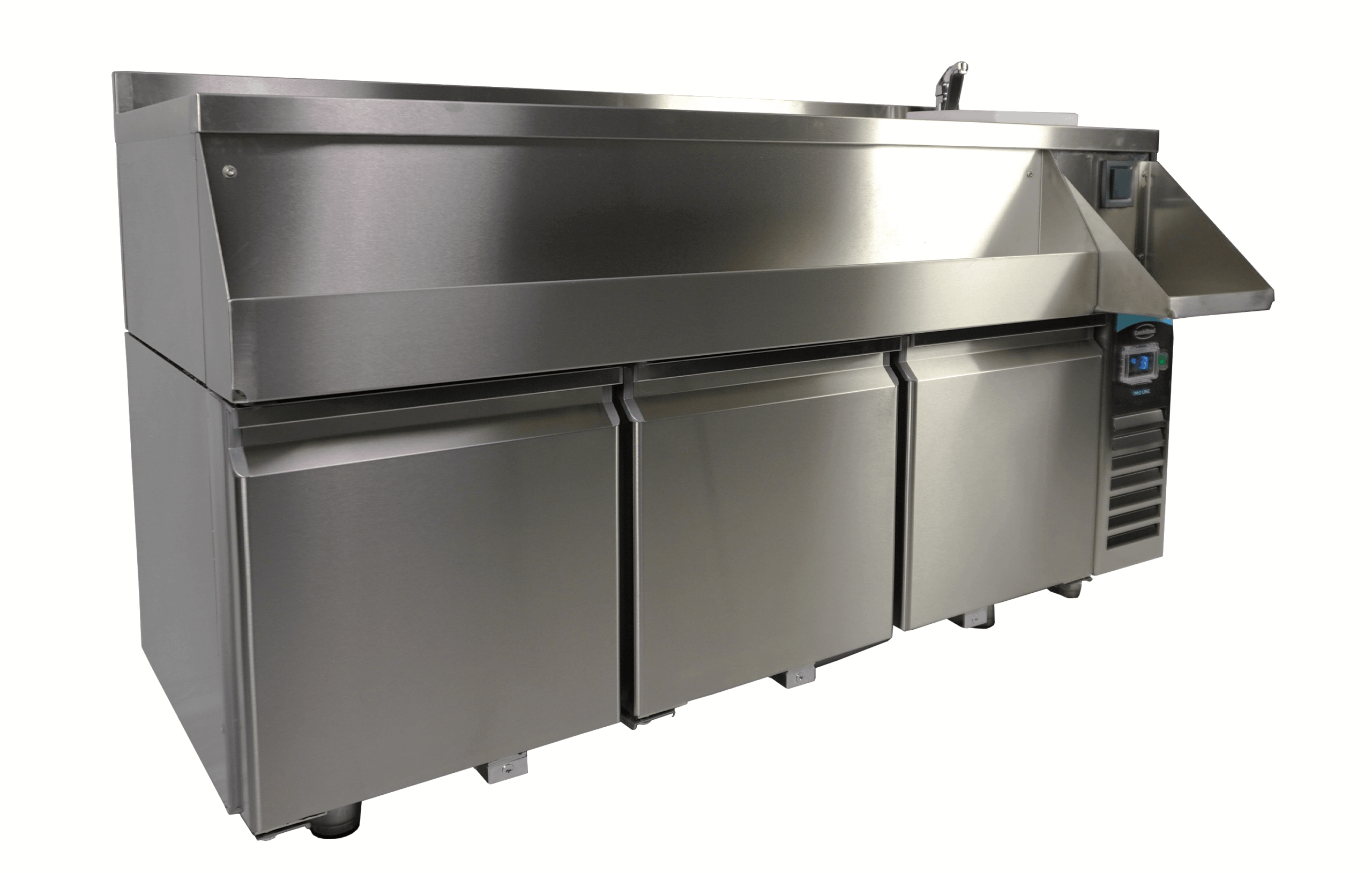 La station de bar à cocktails réfrigérée avec 3 portes est idéale pour les barmen professionnels et offre tout ce dont vous avez besoin pour préparer les cocktails parfaits. À l’avant, une « speedrail » pratique permet un accès rapide aux bouteilles, et une étagère offre de l’espace pour un mixeur. De plus, la station est équipée d’un robinet, d’un évier, d’un lave-verres, d’une planche à découper et d’une prise électrique pour brancher le mixeur. Le système de refroidissement ventilé assure une réfrigération efficace, tandis que la fonction de dégivrage automatique minimise l’entretien. Les dimensions sont 1600x760x1000 mm (LxPxH) – consommation 0,32 kW – capacité 280 litres – température +2/+8ºC – poids 125 kg.