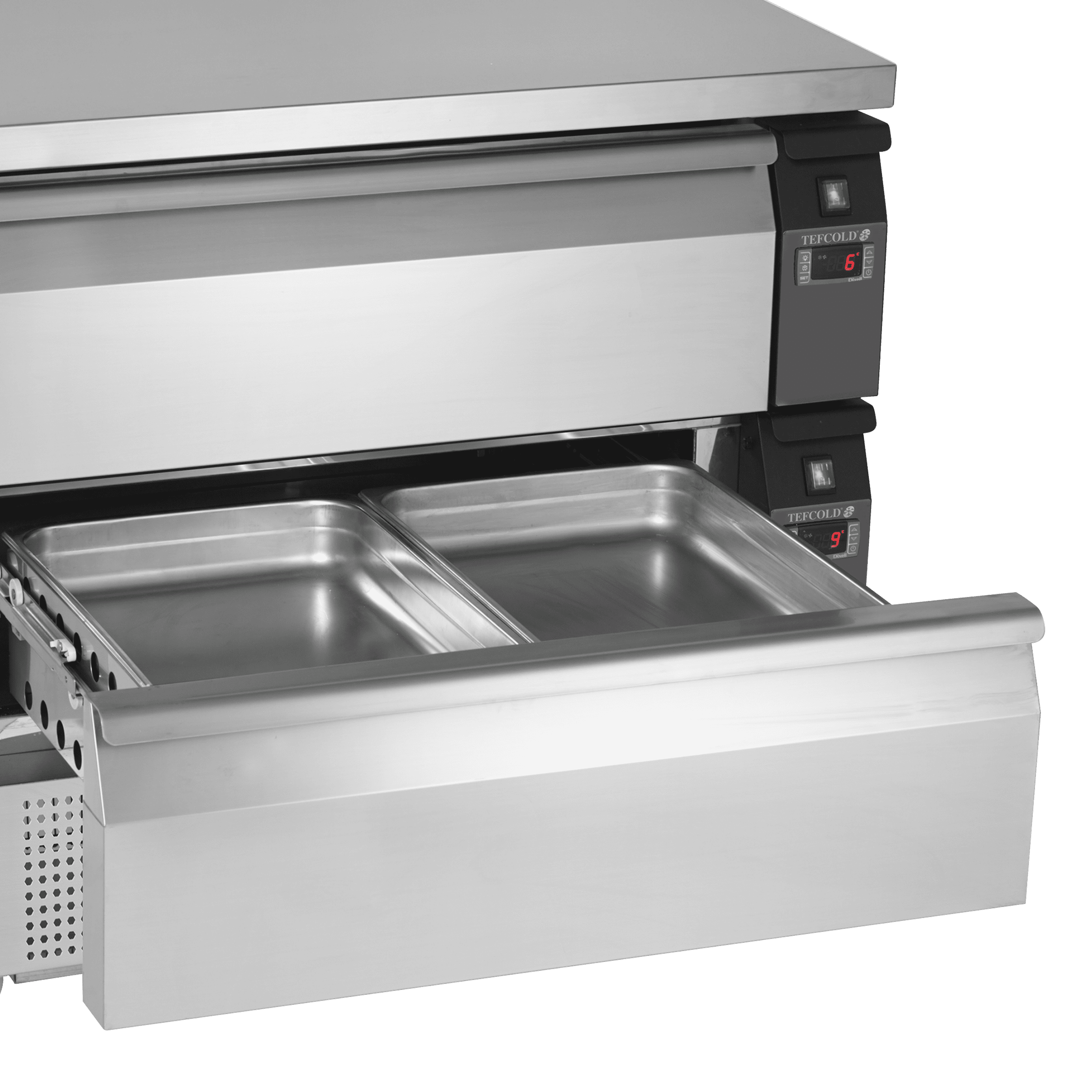 La gamme UD de blocs de tiroirs indépendants offre une grande souplesse d’utilisation en permettant de choisir individuellement une température positive ou négative pour chaque tiroir à l’aide d’un simple bouton. C’est très pratique quand l’espace est compté. Les plages de température disponibles vont de -21 °C à -18 °C, et de +1 °C à +4 °C. Disponible en deux largeurs différentes, avec 1 ou 2 tiroirs. Tous les modèles sont dimensionnés pour les bacs GN jusqu’à 150 mm de haut. La plaque supérieure est prévue pour supporter des appareils lourds, comme des friteuses, des fours, etc.